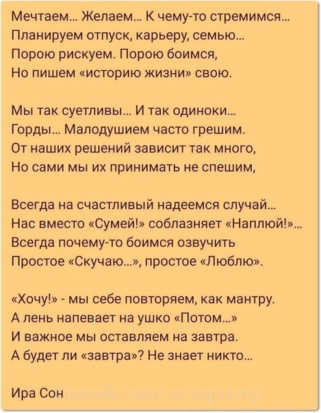 И пусть обрушатся горы с плеч, и пусть осушится боль до дна. Запомни: надо себя беречь! Запомни: ты у ребенка - одна!