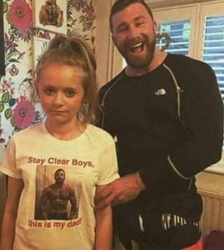 Надпись на футболке: "Держитесь подальше, парни - это мой отец" Забыла надеть футболку