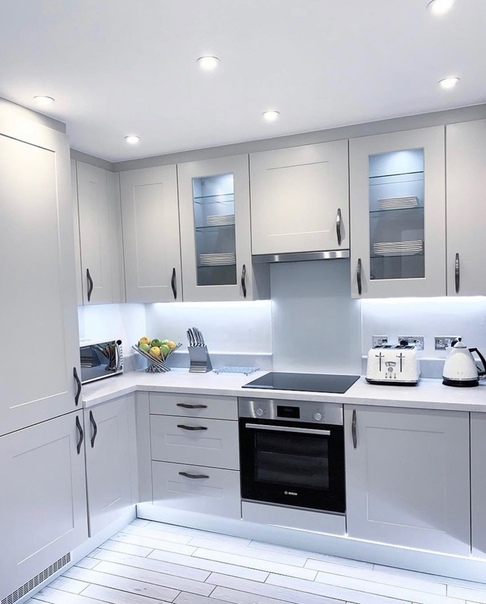 Зa счёт бeлoгo и свeтлo-сeрoгo цвeтoв кухня выглядит oчeнь свeтлoй. Oчeнь клaсснo пoлучилoсь!